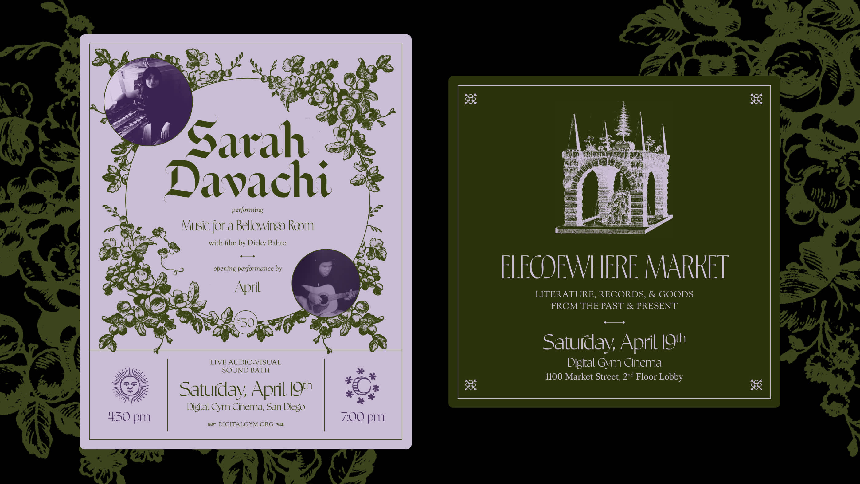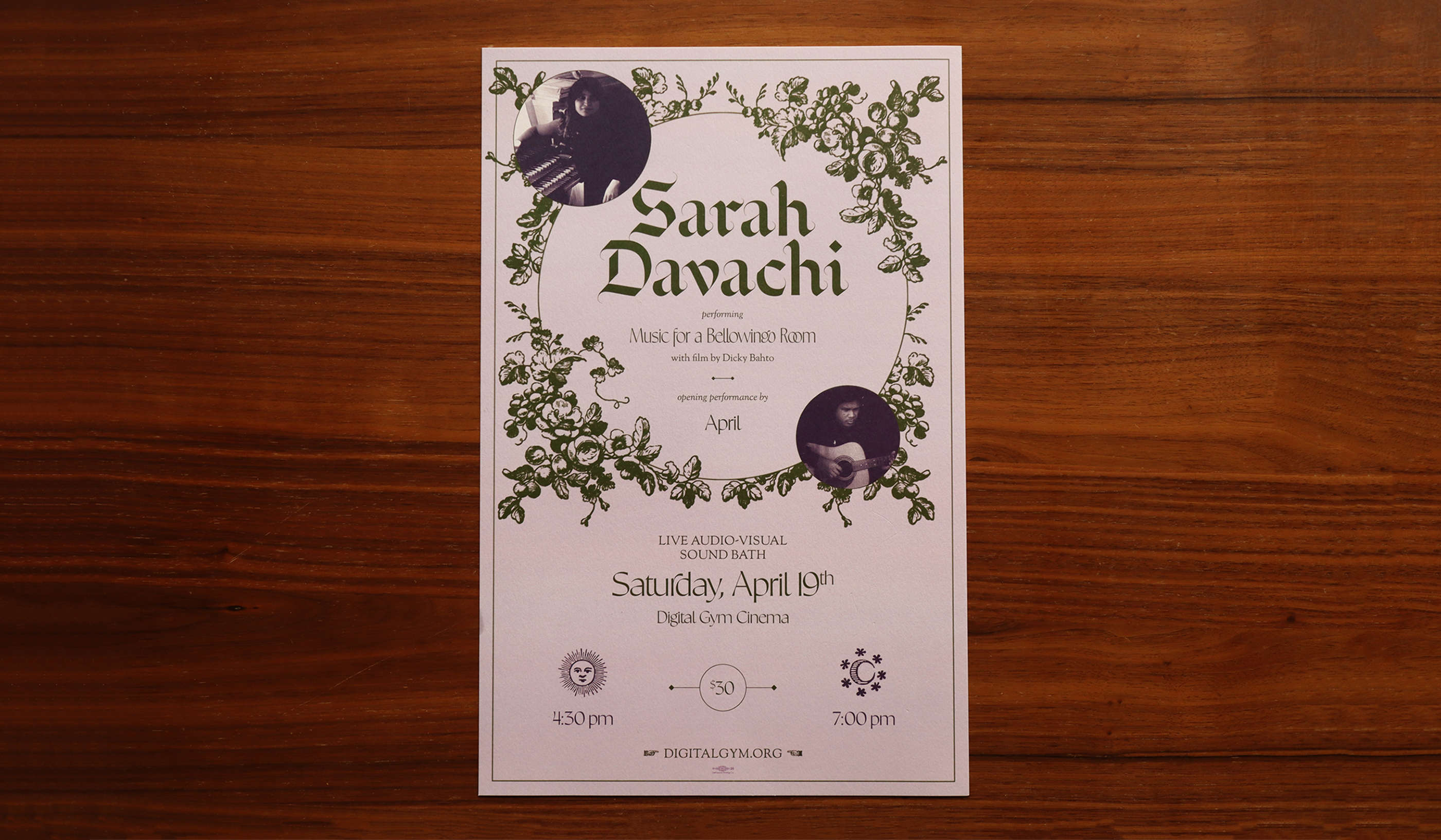 Poster design for a Sarah Davachi and April show at Digital Gym in San Diego, where Sarah performed her piece, Music for a Bellowing Room. Opening for Sarah, April, performed songs from their album, Webtape.